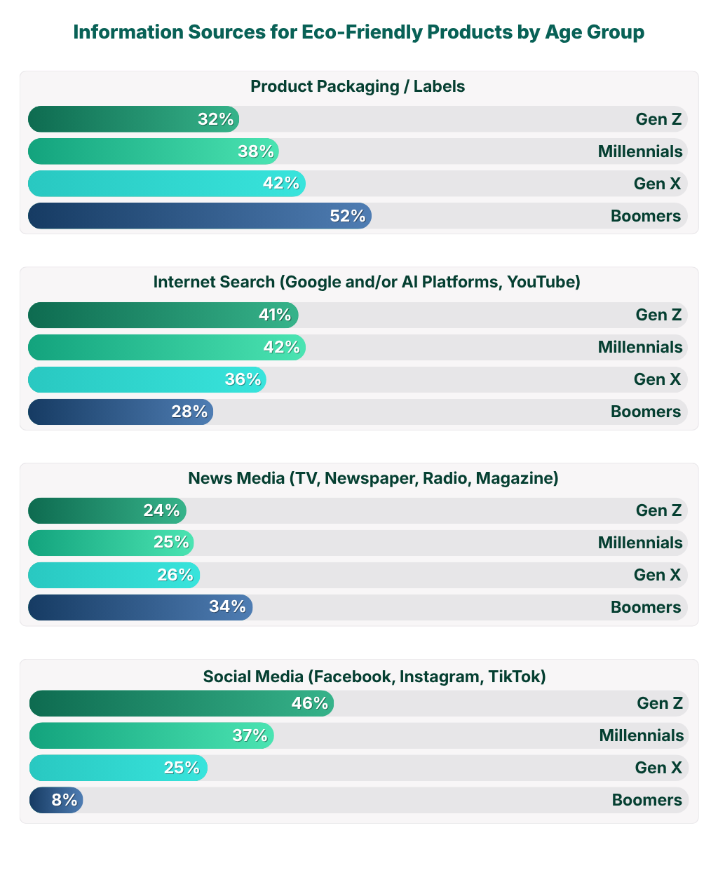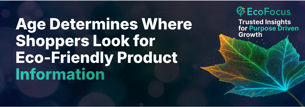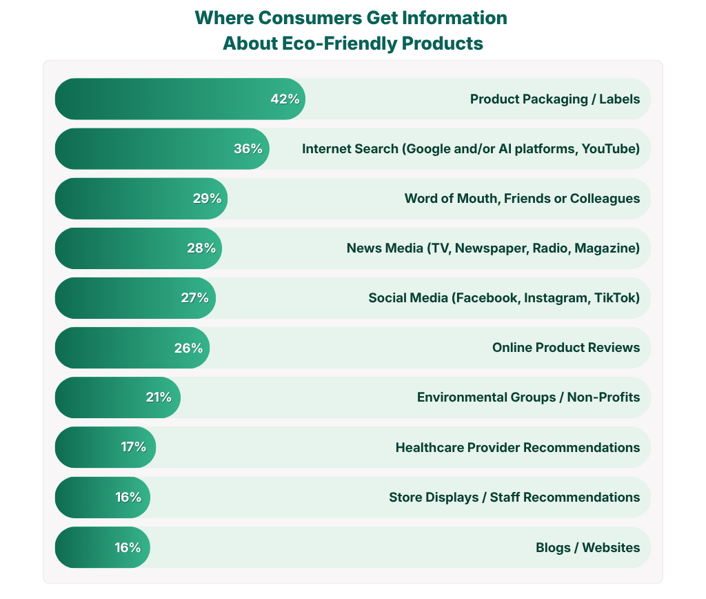 When consumers look for information about eco-friendly products, no single source dominates — but the channel mix shifts sharply by generation. Overall, product packaging and labels top the list (42%), followed by internet search including AI platforms and YouTube (36%), and word of mouth (29%).