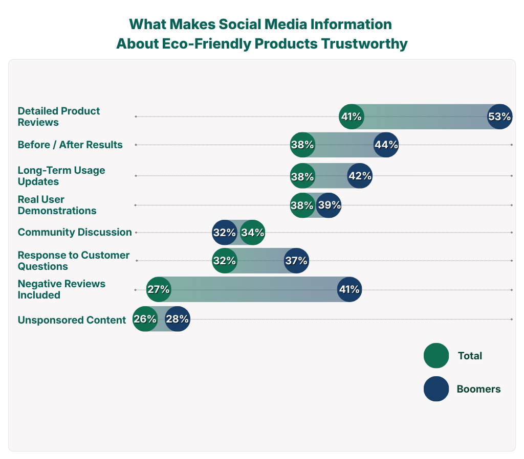For the slightly over one in four consumers who do turn to social media, trustworthiness is earned through specificity and transparency, not polish. Detailed product reviews (41%), before/after results (38%), long-term usage updates (38%), real user demonstrations (38%) all rank well ahead of sponsored or celebrity-driven content. Notably, Boomers who use social media for eco-product information are the most demanding: 53% want detailed reviews and 41% want negative reviews included.