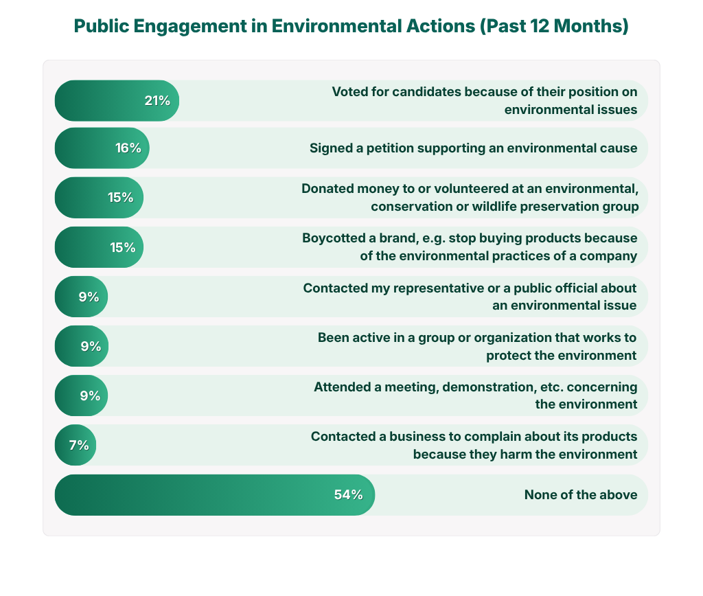 Voting on environmental issues is the most common form of active participation, cited by 21% in the previous 12 months. Signing a petition comes next at 16%, followed by donating to or volunteering with an environmental group and boycotting a brand, both at 15%. Fewer have taken more direct steps—contacting a representative, attending a demonstration, or joining an environmental organization, each at 9%.