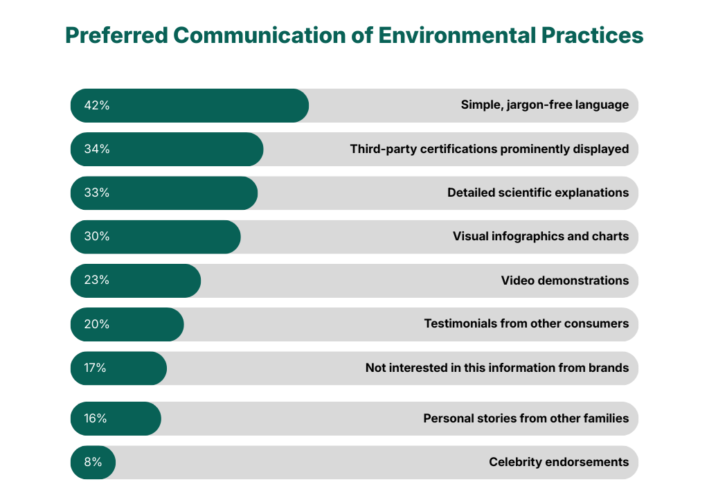 Communication format amplifies credibility when paired with substance. "42% want simple, jargon-free language, 34% want third-party certifications prominently displayed, 33% want detailed scientific explanations, and 30% want visual infographics". The winning formula combines accessible language with verifiable proof—plain explanations anchored by recognized seals and measurable outcomes.